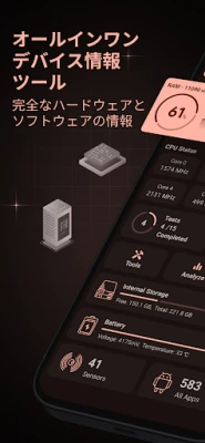 スマートフォンの内部を深く掘り下げ、その性能と状態を完全に把握したいですか?この革新的なツールは、お使いのAndroidデバイスに関するあらゆる詳細を一箇所に集約します。RAM、ストレージ、バッテリーの状態、CPUの活動から、利用可能なセンサーやインストールされているアプリケーションに至るまで、ダッシュボードはあなたのデバイスの健康状態を瞬時に視覚化します。専門家のような深い洞察を、誰でも簡単に手に入れられます。