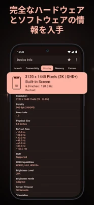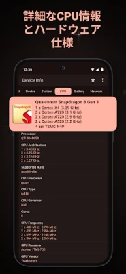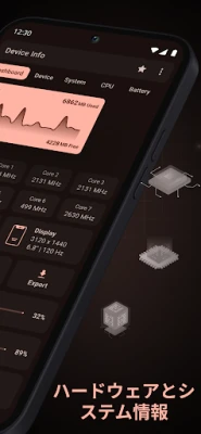 Device Info は、高度なUIとウィジェットでAndroidデバイスのあらゆる情報を網羅する強力なアプリです。CPU、RAM、バッテリー、センサー、ストレージ、ネットワーク、インストール済みアプリ、ディスプレイ、カメラなど、詳細な電話情報を提供。ハードウェアテストでデバイス性能のベンチマークも可能です。