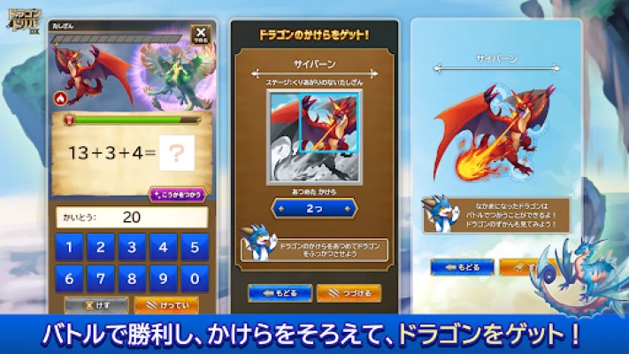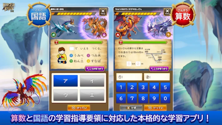 学研ドラゴンドリル 算数/国語の学習アプリは、累計92万部を超える人気教材『ドラゴンドリル』のノウハウを結集し、最新のデジタル学習体験へと進化させました。子供たちの知的好奇心を刺激する本格的な学習アプリとして、封印された伝説のドラゴンたちを解き放つ壮大な冒険が始まります。算数と国語の課題を解き明かすことが、ドラゴンたちを復活させ、最強のパートナーへと育てる鍵となる、全く新しいバトルゲーム形式の学びを提供します。