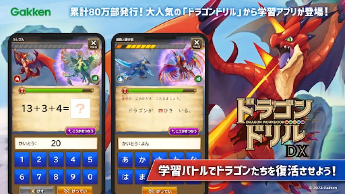 学研ドラゴンドリル 算数/国語の学習アプリは、累計92万部を超える人気教材『ドラゴンドリル』のノウハウを結集し、最新のデジタル学習体験へと進化させました。子供たちの知的好奇心を刺激する本格的な学習アプリとして、封印された伝説のドラゴンたちを解き放つ壮大な冒険が始まります。算数と国語の課題を解き明かすことが、ドラゴンたちを復活させ、最強のパートナーへと育てる鍵となる、全く新しいバトルゲーム形式の学びを提供します。
