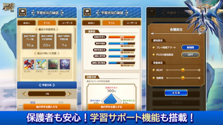 本アプリは、小学校1年生から4年生までの算数全範囲に加え、小学校1年生から2年生までの国語の主要な学習内容を網羅しています。数の基礎から計算、図形、データ分析、単位の概念まで、学年別の算数カリキュラムを深く掘り下げます。国語では、ひらがな・カタカナの習得から語彙、漢字の読み書き、画数・書き順、さらには語句の意味と送り仮名まで、幅広い知識と言葉のルールを楽しく習得できます。問題をクリアするごとに新たなドラゴンと出会い、「ドラゴンずかん」を完成させたり、育成したドラゴンが「キラドラゴン」へと進化する姿は、日々の学習意欲を強力に引き出します。